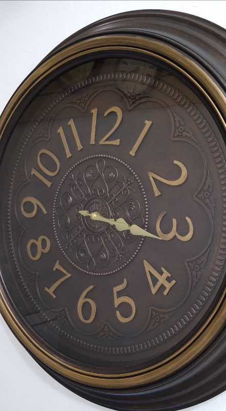 Lindo e elegante relógio de parede, estilo antigo, números romanos e arábicos dourados